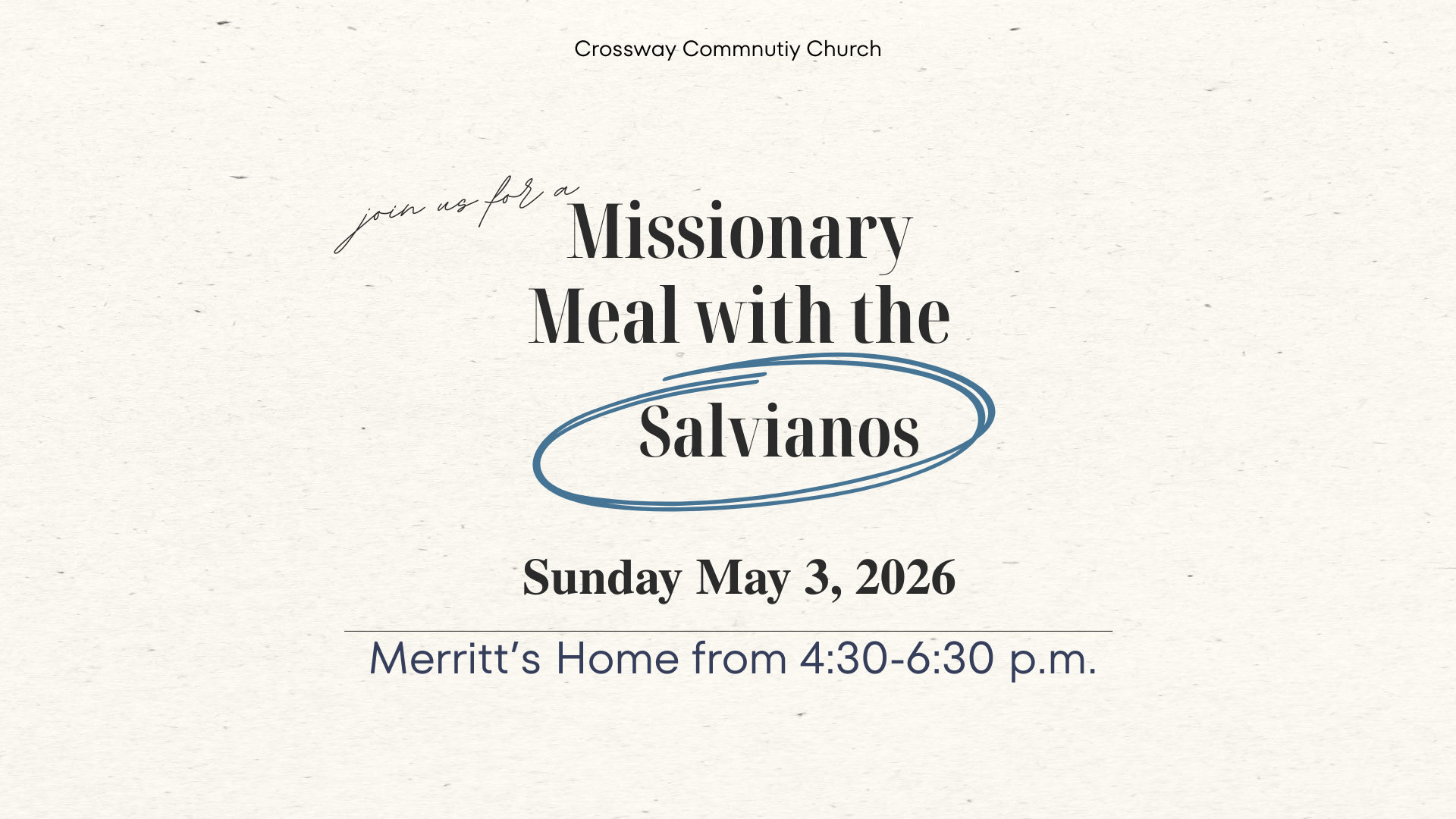 There will be a prayer meeting on Friday, March 20th from 7:30pm- 8:30pm at the Mathews home of focus prayer for Crossway, our city, our state and nation, the world. All are welcome, address is found in the directory.